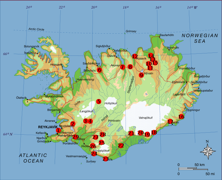 Tuffschlucht Fjaðrárgljúfur; Lavamassen von Laki (Eldhraun oder Feuerlava) (22); Tuffberg Reynisfjall mit Blick auf die Basaltfelsen Reynisdrangar und den Vogelfelsen Dyrhólaey (23); Wasserfall Skógafoss (24)