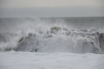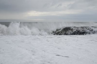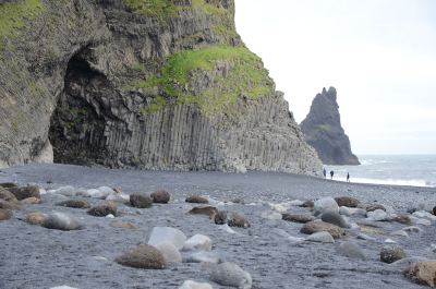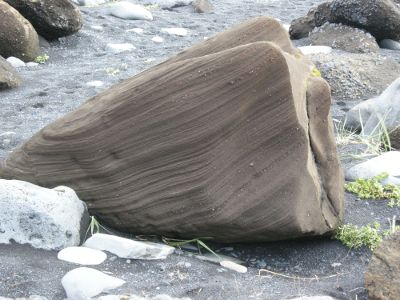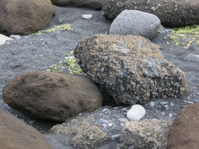 Die Steine hier am Strand wurden vom Meer angespült. Das Braune ist →Tuff, das Graue →Lava.
