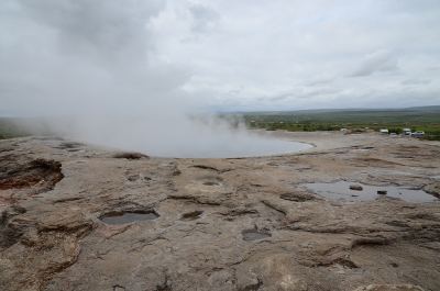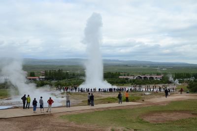 Während im Kraftwerk das heiße Wasser über Bohrlöcher nach oben befördert werden muss, tritt es im Hochtemperaturgebiet in Haukadalur von selbst an die Oberfläche. Hier gibt es mehrere heiße Quellen, darunter den berühmten Großen Geysir (der namensgebend für alle Springquellen ist, die nach ihm Geysire oder Geiser heißen) und den kleineren Strokkur. Strokkur hat allerdings den Vorteil, dass er nach wie vor sehr regelmäßig ausbricht, während der Große Geysir sich nur sehr selten dazu durchringt.