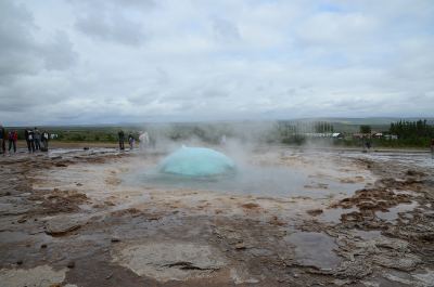 Der Name „Strokkur“ bedeutet übersetzt Butterfass (warum auch immer man einen Geysir so nennt). Er bricht regelmäßig im Abstand weniger Minuten aus und erreicht eine Höhe von 25 bis 30 m.