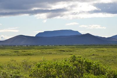 Die isländischen Tafelberge entstehen nicht, wie bspw. im Elbsandsteingebirge durch Erosion von Sedimentgesteinen, sondern wenn Lava sich von unten in einen Eisschild frisst. Nach Abschmelzen des Gletschers bleibt der Tafelberg übrig. Sie bestehen aus →Tuff und sind oben – wo der Berg aus dem Eis herausragte – oft von einer Lavaschicht bedeckt. Der berühmteste Tafelvulkan Islands ist die Herðubreið, die wir auf dieser Reise aber nur von weitem zu Gesicht bekamen.